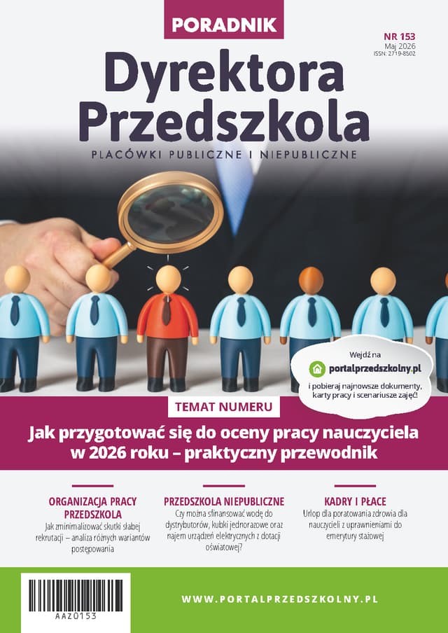 Majowe wydanie „Poradnika Dyrektora Przedszkola” poświęciliśmy wyzwaniom końcówki roku szkolnego i zbliżających się wakacji. Piszemy o tworzeniu grup mieszanych, słabej rekrutacji, przygotowaniu placówki do sezonu urlopowego oraz zapewnieniu ciągłości pracy i bezpieczeństwa dzieci. W numerze omawiamy też ocenę pracy nauczyciela w 2026 roku, zatrudnianie nauczyciela początkującego, organizację zastępstw i urlop dla poratowania zdrowia. Nie zabrakło również tematów ważnych dla przedszkoli niepublicznych, w tym wydatków z dotacji oświatowej i dokumentów potrzebnych do utworzenia oddziału specjalnego.