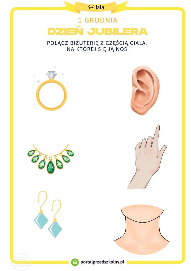 Pobierz gotową do wydrukowania kartę pracy na 1 grudnia (Dzień Jubilera). Poziom trudności zadań na karcie został dostosowany do możliwości 3 i 4-latków.
