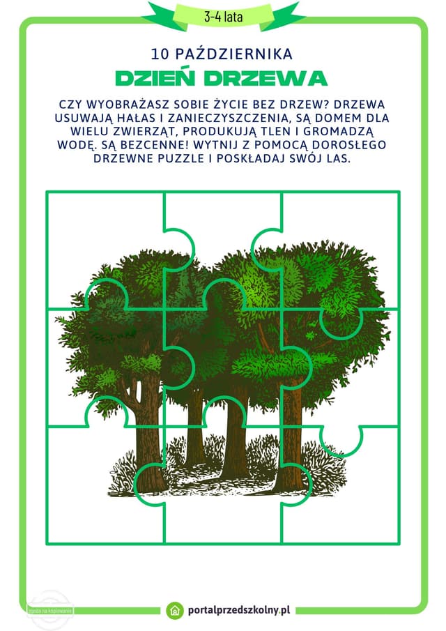 Pobierz gotową do wydrukowania kartę pracy na 10 października (Dzień Drzewa). Poziom trudności zadań na karcie został dostosowany do możliwości 3 i 4-latków.