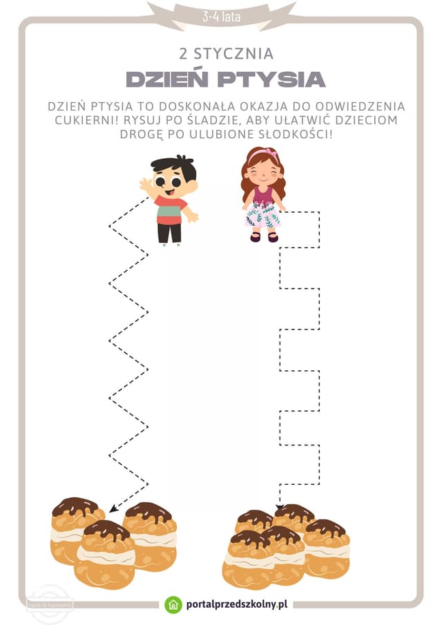 Pobierz gotową do wydrukowania kartę pracy na 2 stycznia (Dzień Ptysia). Poziom trudności zadań na karcie został dostosowany do możliwości 3 i 4-latków.