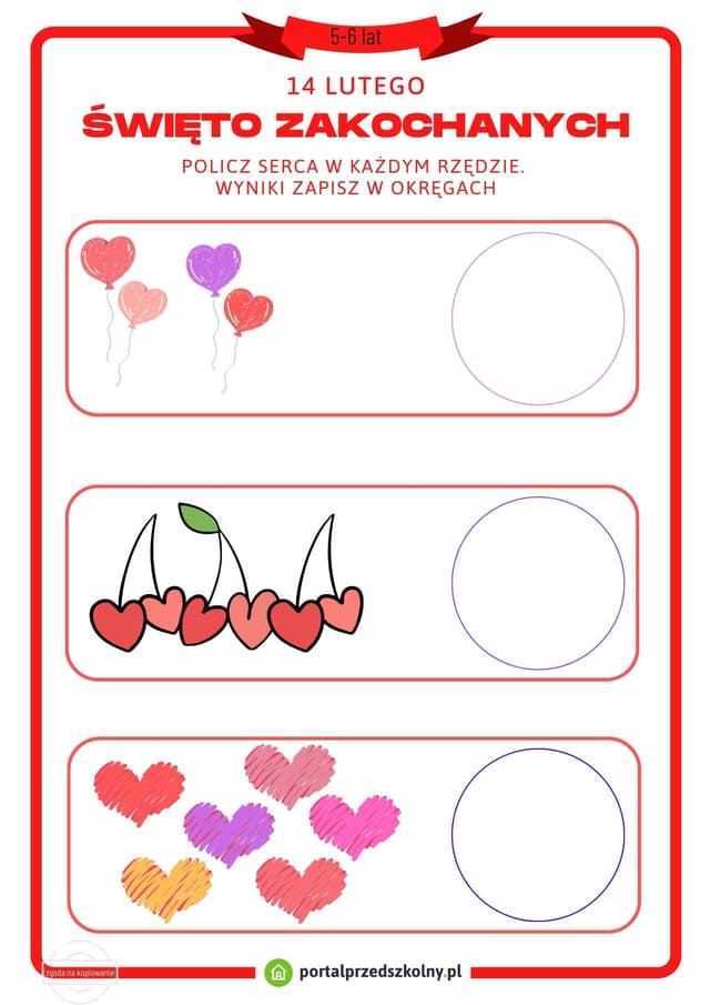 Pobierz gotową do wydrukowania kartę pracy na 14 lutego (Święto Zakochanych). Poziom trudności zadań na karcie został dostosowany do możliwości 5 i 6-latków.