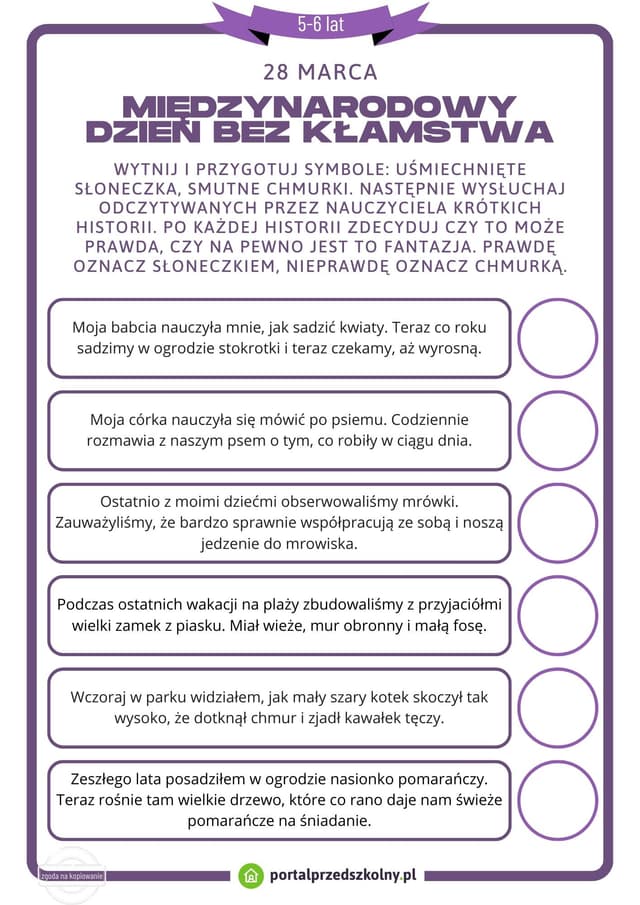 Karta pracy dla 5 i 6-latków na 28 marca (Międzynarodowy Dzień bez Kłamstwa)